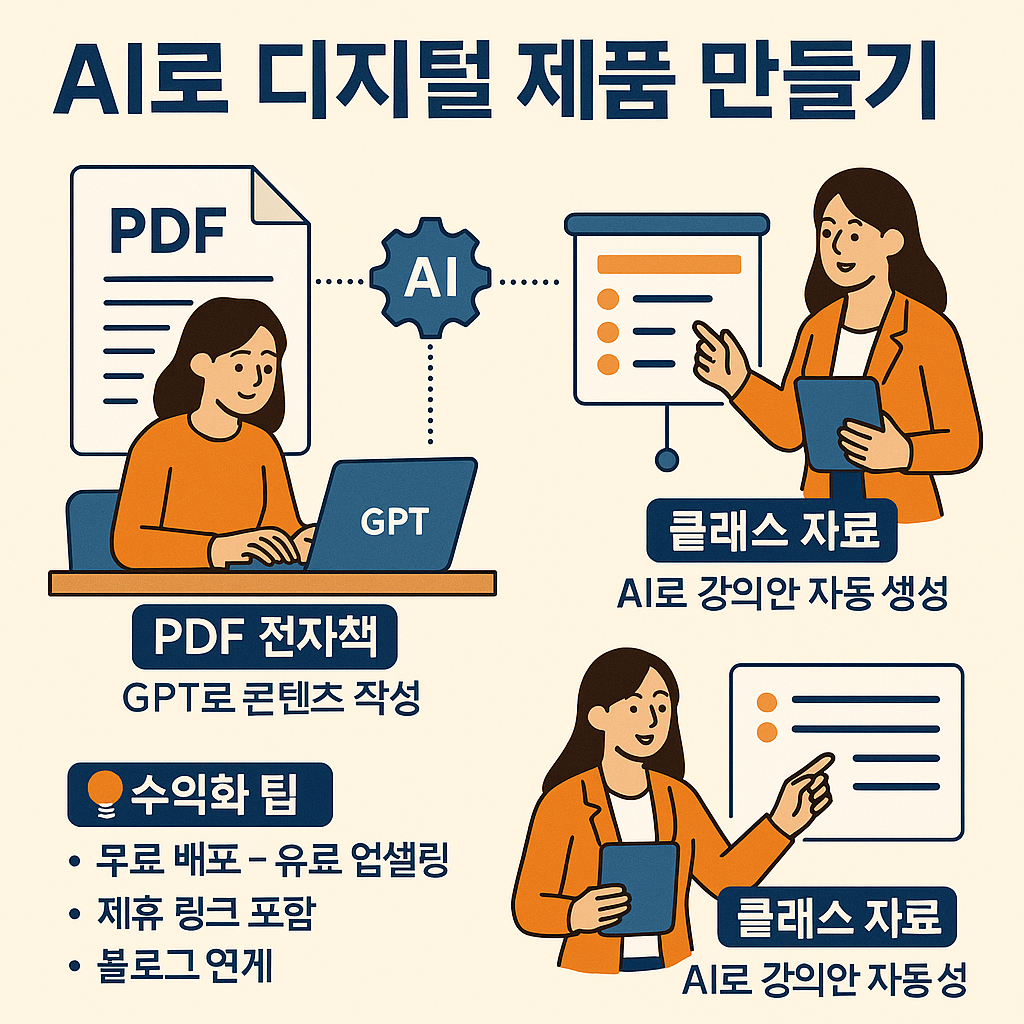 📄 AI로 디지털 제품 만들기 – PDF, 템플릿, 클래스 자동 제작법온라인에서 수익을 만들 수 있는 가장 스마트한 방법, 바로 디지털 제품 판매입니다. GPT와 같은 AI를 활용하면 전자책, 워크북, 템플릿, 강의안까지 혼자서도 자동 제작 가능합니다. 이번 글에서는 AI를 활용해 실제 판매 가능한 디지털 제품을 제작하고 수익화하는 전체 과정을 알려드립니다.📌 디지털 제품이란?디지털 제품은 물리적 재고가 없는 다운로드 가능한 콘텐츠로, 예를 들어:✅ PDF 전자책 / 워크북✅ Notion, Excel, Canva 템플릿✅ 온라인 강의 / PDF 클래스 자료✅ AI 프롬프트 모음집, 업무 자동화 매뉴얼디지털 제품의 장점은 한 번 만들어두면 무제한 판매 가능하다는 것입니다.✍️ PDF 전자책 만들기 (G..