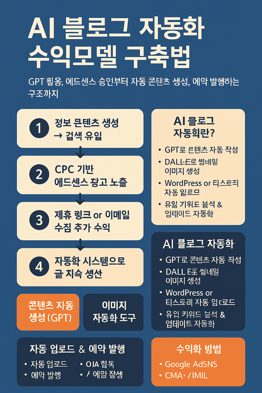 💻 AI 블로그 자동화 수익모델 구축법 – 콘텐츠, 트래픽, 광고까지 한 번에매일 글을 쓰기 힘든가요? 블로그 수익을 만들고 싶지만 시간이 부족한가요? 이제는 AI를 이용해 블로그를 자동화하고, 수익까지 연결할 수 있는 시대입니다. 이번 글에서는 **GPT 기반 자동 콘텐츠 생성부터 애드센스 승인, 제휴 수익 확장**까지 전체 수익모델을 실전 중심으로 안내해드립니다. 📌 AI 블로그 자동화란?AI 블로그 자동화는 GPT 등 인공지능 도구를 활용하여 글쓰기, 썸네일 생성, 예약 발행, SEO 최적화 등 블로그 운영의 주요 작업을 자동화하는 것을 의미합니다.✅ GPT로 콘텐츠 자동 작성✅ DALL·E로 썸네일 이미지 생성✅ WordPress or 티스토리 자동 업로드✅ 유입 키워드 분석 & 업데이트 자동..